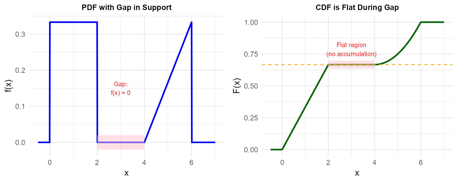 In any region where the PDF is \(0\), the CDF is flat, but not necessarily 0. It retains any area accummulated in previous regions, but no area accummulates additionally.