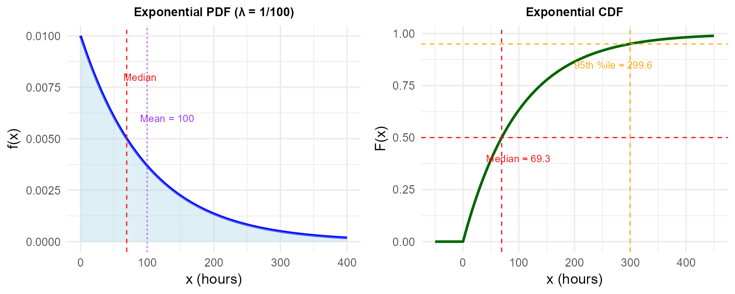 \[F_X(x_{0.5}) = P(X \leq x_{0.5})= 0.5.\]\(x_{0.5}\) represents the vertical cutoff on the PDF of \(X\) such that the area to its left is exactly \(0.5\). This special percentile is also called the median (\(\tilde{\mu}\)) of \(X\).