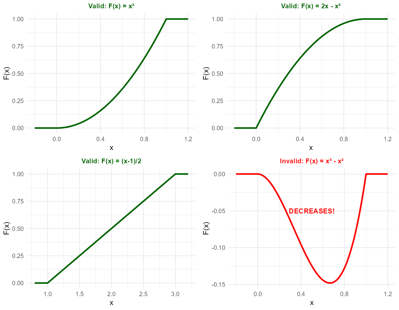 Cumulative distribution functions must satisfy several mathematical properties that reflect their probabilistic interpretation.