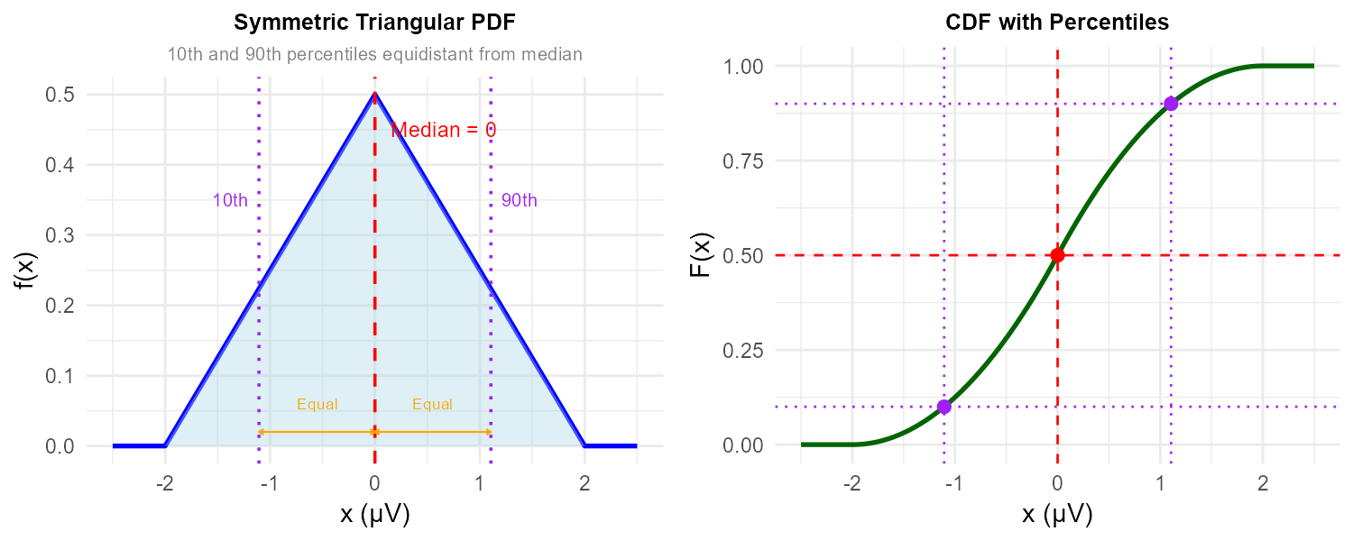 Fig. 6.24 Symmetric triangular PDF with 10th and 90th percentiles marked equidistant from the median.