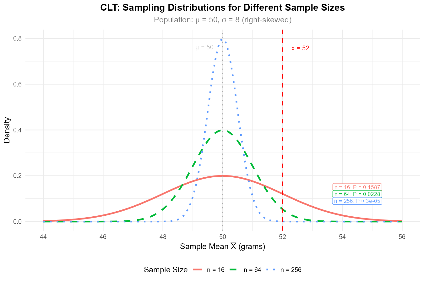 Population B (heavily right-skewed) requires a larger sample size. The CLT converges faster for distributions that are closer to normal. Symmetric distributions converge quickly (often \(n \geq 15\text{--}20\) suffices), while heavily skewed distributions may need \(n \geq 50\) or more. The greater the departure from normality, the larger the \(n\) needed.