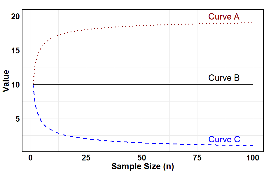 (C) TRUE. \(E[\bar{W}] = \mu = 10\) regardless of sample size. Curve B is the horizontal line at 10, correctly representing this constant value.