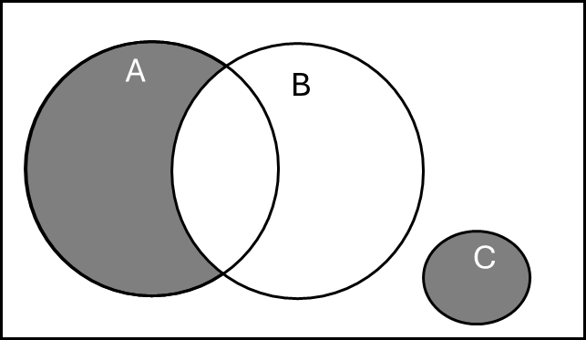 The shaded region is \((A \setminus B) \cup C\), i.e., the part of \(A\) that does not intersect \(B\), together with all of \(C\). Its probability is \(P(A) - P(A \cap B) + P(C)\).