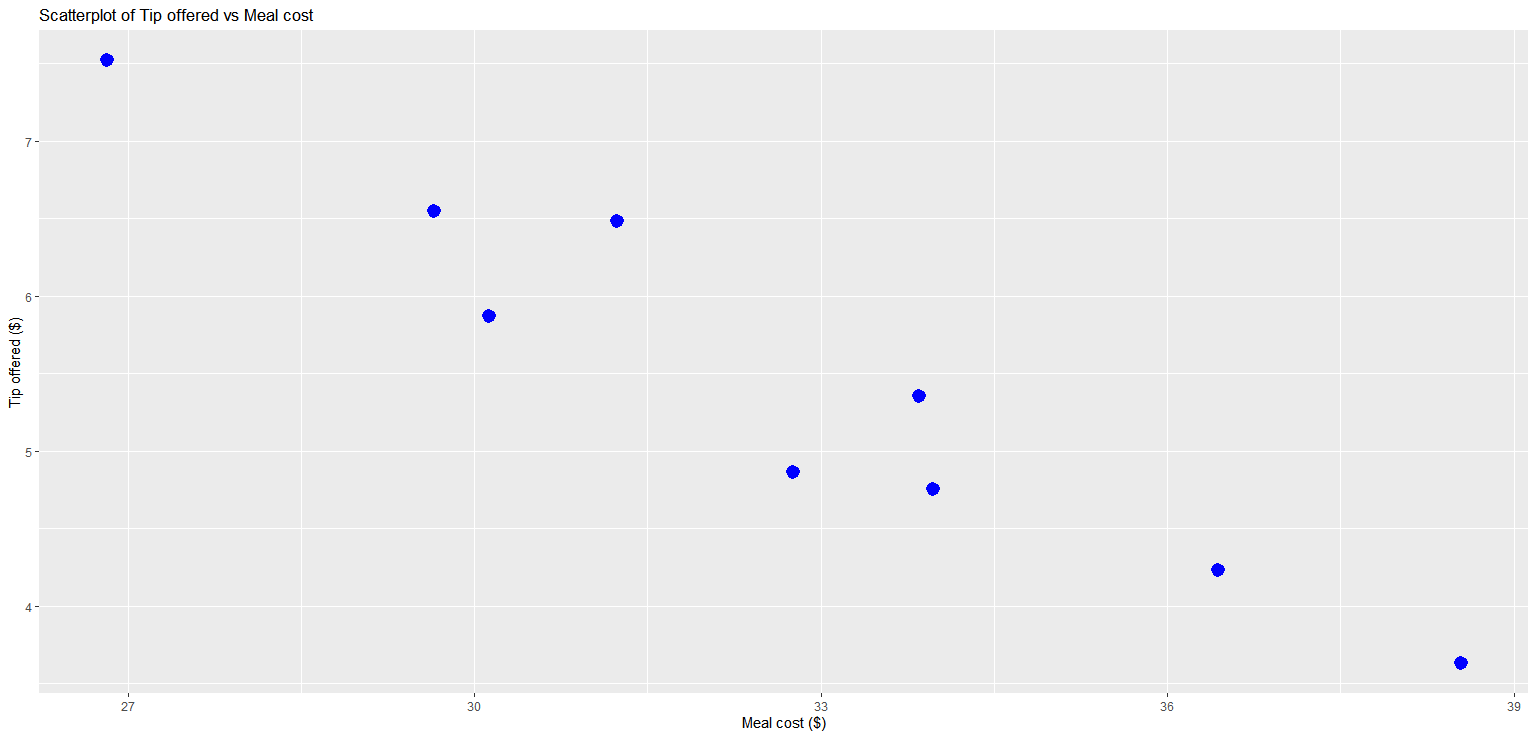 A STAT 350 student sought to explore the relationship between the cost of a meal for a single diner (\(x\)) and the tip amount offered (\(Y\)). The student selected nine specific meal costs and, for each cost, recorded a randomly selected tip amount from diners at a restaurant in Greater Lafayette.